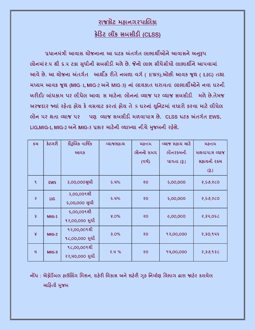 મળવાપાત્ર છે. CLSS ઘટક અંતર્ગત EWS. LIG,MIG-1, MIG-2 અને MIG-3 પ્રકાર માટેની વ્યાખ્યા